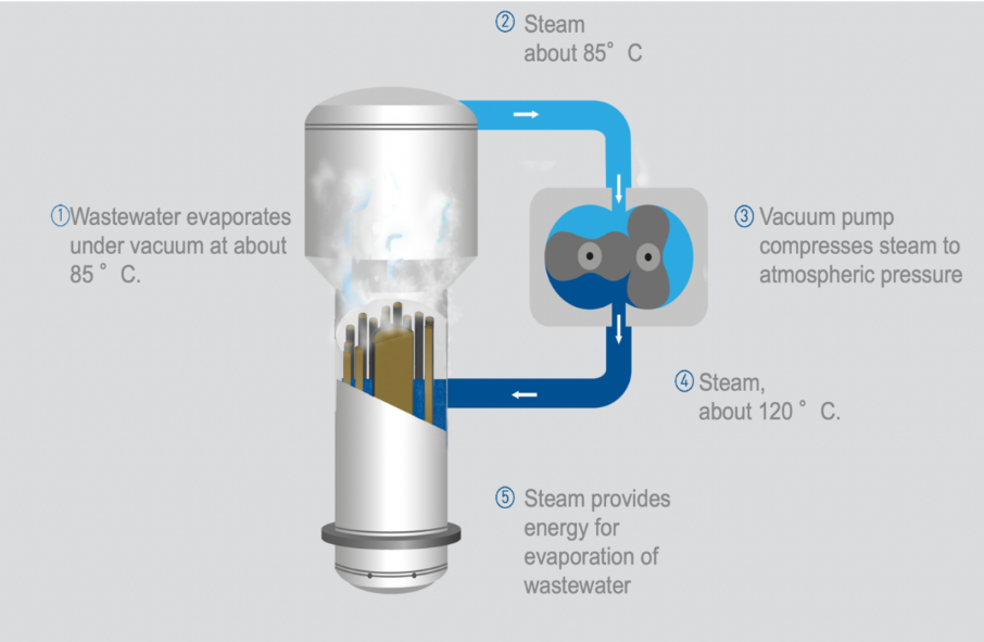 c) Evaporation:Once boiling at 85°C for a few minutes, the water begins to evaporate. These vapours are then compressed by a vacuum pump, leading to a temperature increase up to 120°C. These high-temperature vapours are subsequently directed to tubes on the outside of the system, where they come into contact with cooler wastewater (initially at 85°C). As a result of this temperature difference (ΔT), the vapour loses energy, condenses, and forms condensate with a temperature of around 100°C. This condensate is passed through a pre-heat exchanger to further heat the incoming wastewater and recover additional energy.